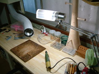 しかし、05年11月 念願の新工房への引越しが始まり、休日の合間に工具や材料を運び、そして作業机や換気扇の製作、取り付けなど夜遅くまで作業を続けた結果、ようやく工房らしい形になってきました。 新工房は築30年余りの木造古家で一年ほど空き家だったものを2室だけ使用させてもらっています。今までのように後片付けの必要もなく雨や騒音、粉塵も気にすることはありません 快適です。 |