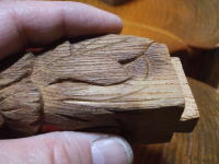 T さんが洗剤でゴシゴシと洗い、なんとか木の色に近づけることができました。 しかし今回紹介する作品は泉国細工さんが同様に古い部品を使って作ったものですが、なんと木肌が新調彫刻の様に見事、ケヤキ色が復活していました。 目を凝らして彫刻をよ〜く見てから泉国細工さんに聞くと、すべてノミと彫刻刀で削り直したとのことでした。 ん〜私にはとてもマネすることができるはずもないので、とりあえず部品を渡して 「 これをなんとか削りなおして・・・・」 と お願いしました。 |